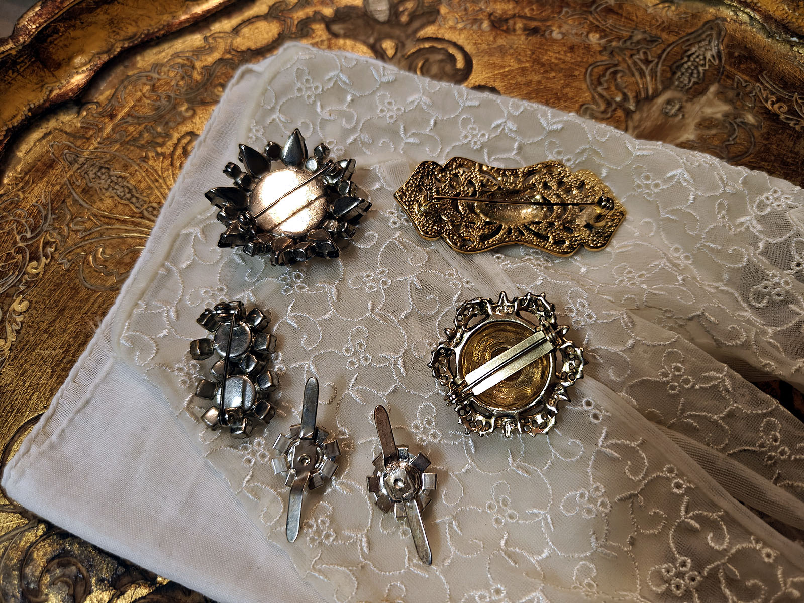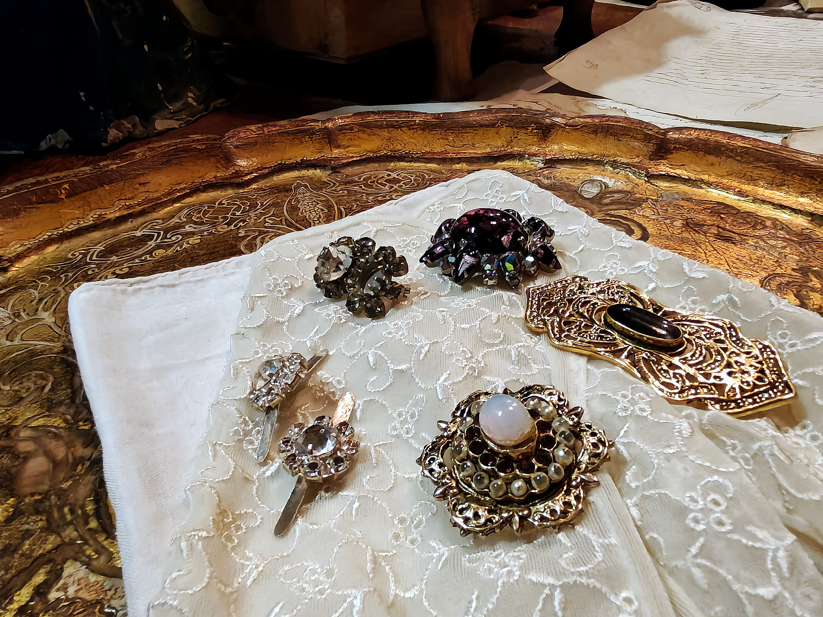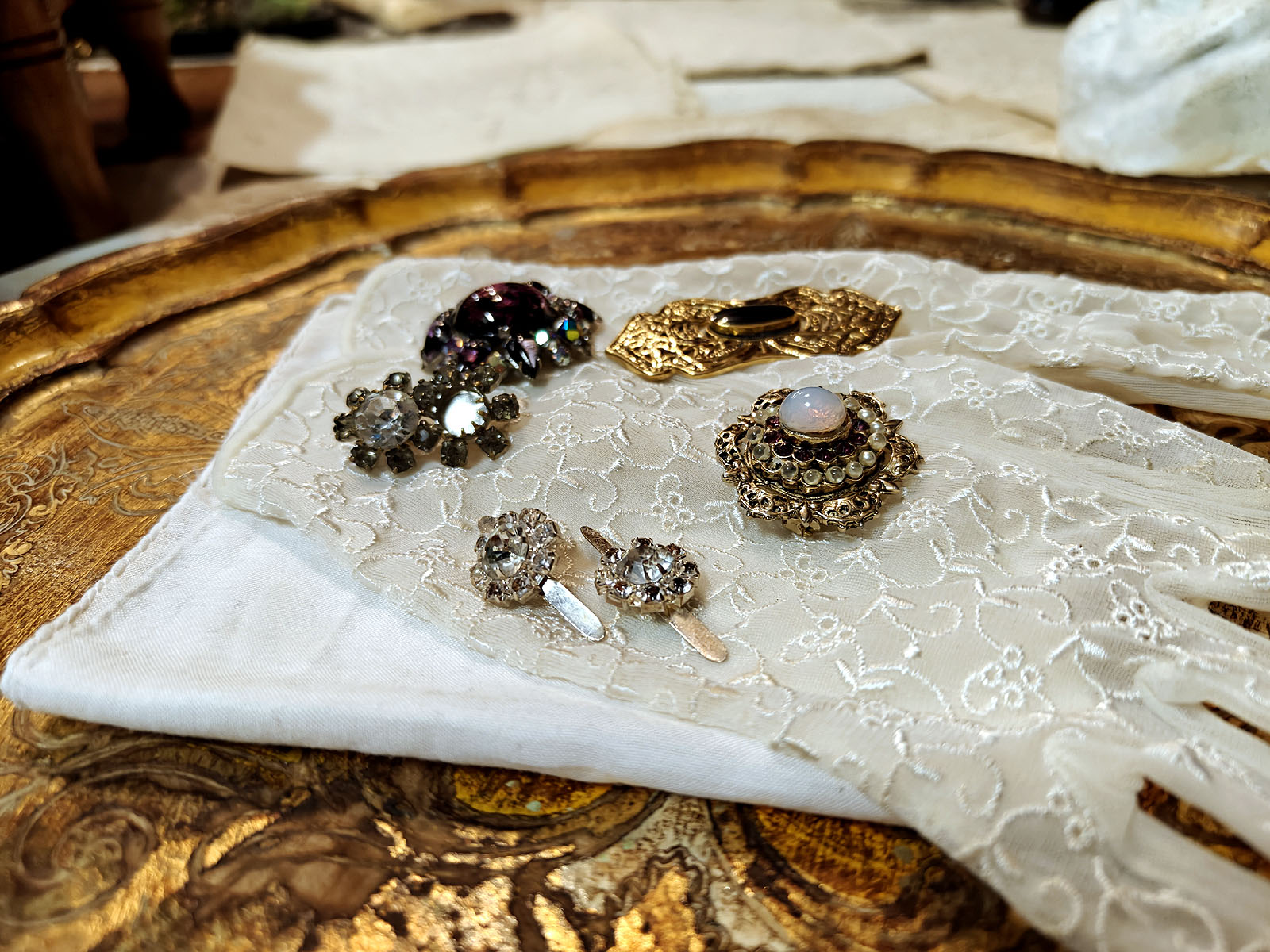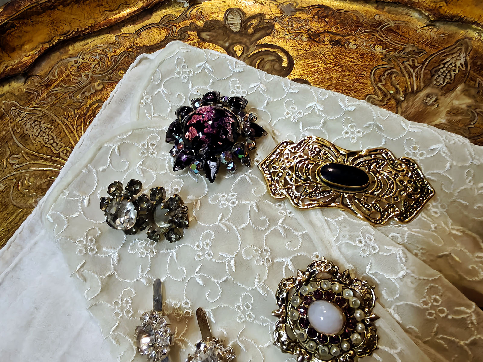 Kokoelman sisällä on useita eri tyylisuuntia ja käyttötarkoituksia. Suurikokoinen mustakivinen ”brooch” edustaa klassista, lähes viktoriaanista dramatiikkaa, kun taas helmikehäinen pyöreä rintaneula viittaa 1950‑luvun hienostuneeseen juhlatyyliin. Violetti‑ ja pinkkisävyinen kukkakoru on tyypillinen 1960‑luvun romanttiselle muotokielelle ja kristallikoristeiset hiusneulat tuovat kokonaisuuteen keveyttä ja valon leikkiä. Tumma, kimaltava korvakorupari puolestaan edustaa aikakauden iltakoruja, joissa korostui glamour ja näyttävyys. Jokainen koru on kuin oma pieni tarinansa ja yhdessä ne muodostavat intiimin katsauksen yhden ihmisen makuun, tyyliin ja elämänvaiheisiin.