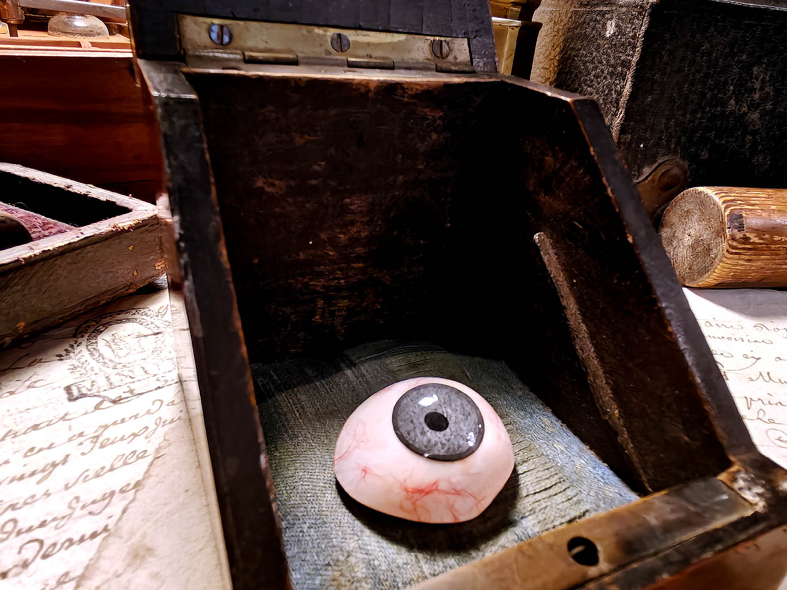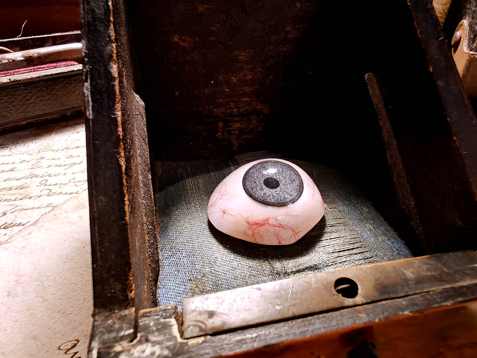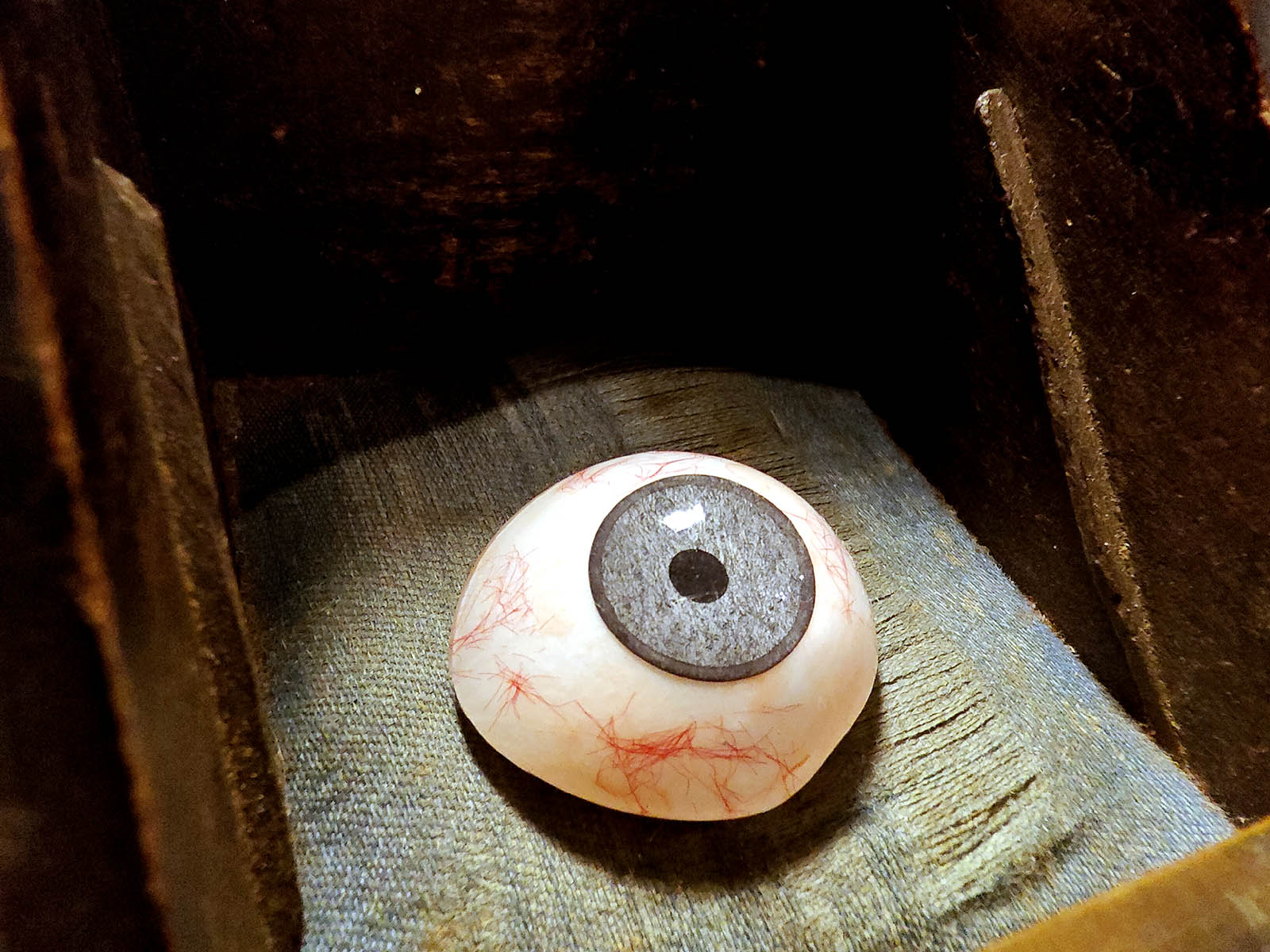 Muuta: Äärimmäisen upea kohde, todellinen keräilyherkku. Kyseessä yksityiskohtainen ja laadukkaasti valmistettu silmäproteesi / tekosilmä (kts. pupilli / verisuonisto. Lasisilmiä valmistettiin erityisesti Saksassa, Ranskassa ja Englannissa 1800 luvun lopulta lähtien ja niitä käytettiin sekä proteesina silmän menettäneille potilaille, että opetusvälineinä lääketieteellisissä laitoksissa.