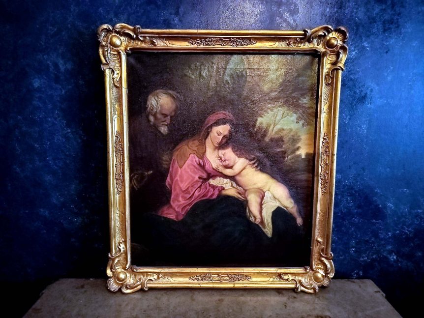 Tekijä / taiteilija: Tuntematon mestari Alkuperämaa: Italia? Signeeraus: – Valmistusajankohta: 1800-l. Tekniikka: Öljy kankaalle Koko: 81 cm x 72 cm (kehysten kanssa) Kehykset: Arvokehykset, koristeelliset ja patinoituneet kultaukset, yksi pieni palapuutos, joka näkyy lisäkuvassa Kunto: Hyvä, kangas ehjä, värit ovat syvät ja kauniit Muuta: Kohteena todella kaunis ja yksityiskohtainen öljymaalaus, jonka alkuperä sijoittuu 1800-luvulle. Maalauksessa on ehdottomasti aitoa ”Barokki-tunnelmaa” ja …