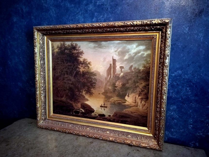 Alkuperämaa: Eurooppa Tekijä / taiteilija: Tuntematon Valmistusajankohta: 1800-luvun alku Tekniikka: Öljy kankaalle Koko: 71 cm x 60 cm (kehysten kanssa) Signeeraus: Ei Kehykset: Alkuperäiset, 1800-luvun todella hienot ja massiiviset arvokehykset, joissa kaunis patina Kunto: Hyvä, ajanmukaista kulumaa Muuta: Erinomaisen tunnelmallinen ja yksityiskohtainen öljymaalaus, jossa kauniissa linnan raunion maisemissa on kalastajat työssään. Kuvistakin voi jo huomata, niin maalaus on todellinen mestariteos …
