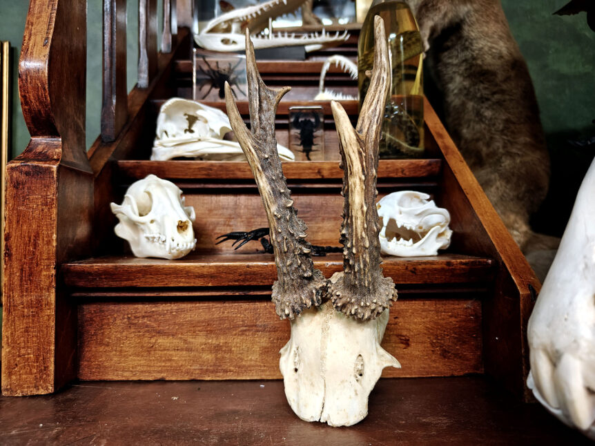 Alkuperä: Ranska Ajankohta: 1900-luvun loppu Laji: Capreolus capreolus (metsäkauris) Koko: K 24 cm, L 9 cm, S 12 cm Rakenne: Trofeeksi sahattu yläkallo (kallonpohja), johon näyttävät kolmihaarasarvet ovat kiinnittyneet luonnollisessa muodossaan. Metsäkauriille tyypilliset sarvet, helmimäinen tyviosa ja siro, kevyt kallorakenne. Luun pinta on vaalea ja tasainen, sarvien sävy lämmin ruskea. HUOM! Kyseisiä kalloja on muutama ja ne voivat poiketa hiukan kuvassa …