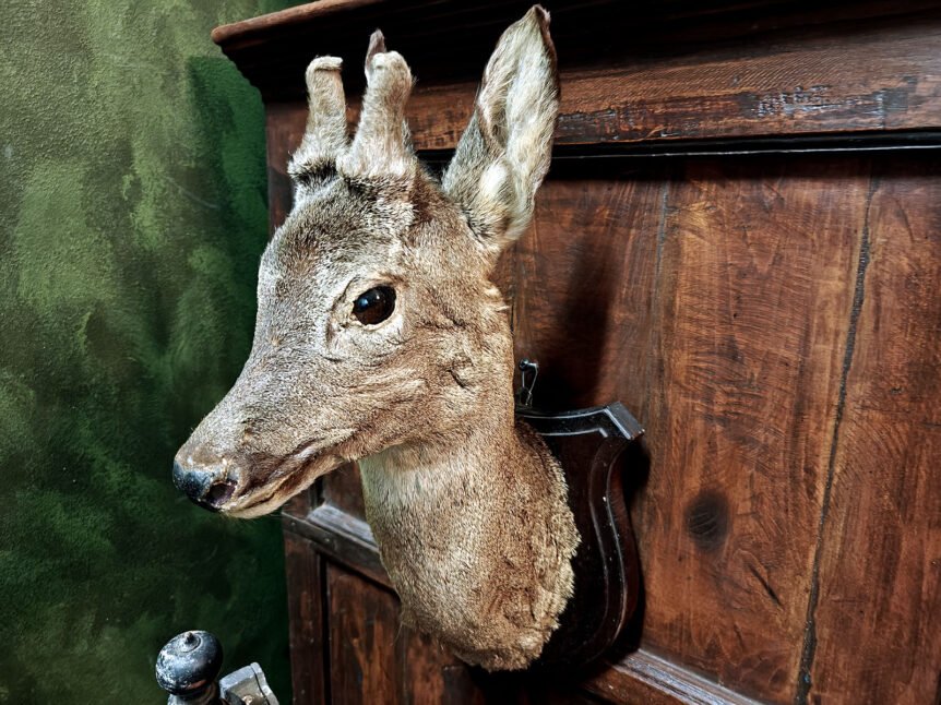 Alkuperä: Saksa Laji: Metsäkauris (Capreolus capreolus) Valmistusajankohta: 1970–1980 Koko: Korkeus 52 cm, leveys 24 cm, syvyys 27 cm Kunto: hyvä; ikäpatinaa ja luonnollista kulumaa, joka korostaa autenttisuutta Muuta: Tämä upeasti täytetty metsäkauriin pää (tai trofee) on todellinen katseenvangitsija ja se on valmistettu alun perin osaksi metsästysmajan, kabinetin tai kirjastohuoneen sisustusta. Sarvien nahkapeitteinen bastivaihe kertoo, että eläin on kaadettu sarvien kasvukaudella …