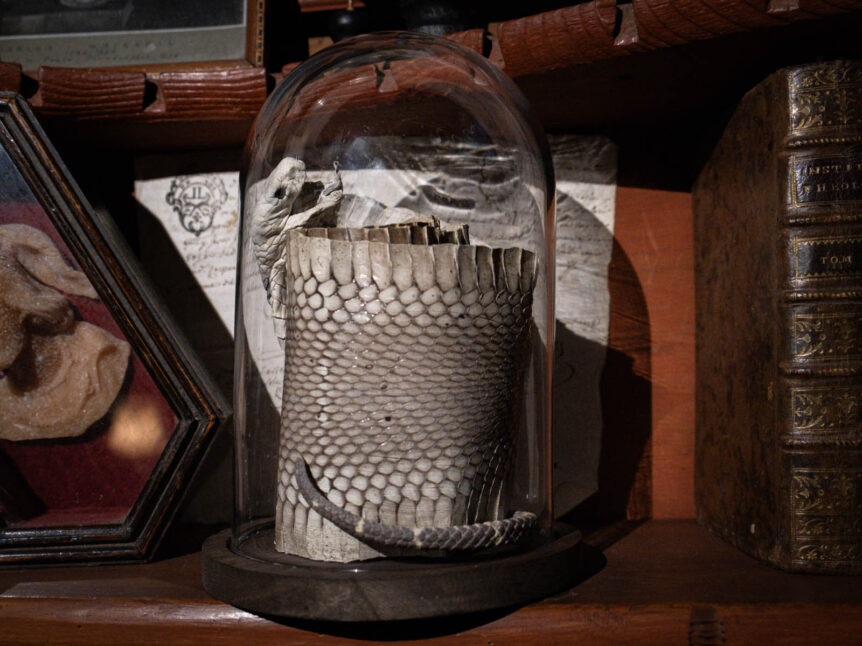 Alkuperä: Aasia Laji: Todennäköisesti Intiankobra (Naja naja) Valmistusajankohta: Tuotu suomeen 1900-luvulla, lasikupu 2000-luku Materiaali: Parkittu käärmeennahka, lasikupu ja puualusta Mitat: Nahan pituus 120 cm (pää ja häntä mukana), lasikuvun korkeus 20 cm, pohjan halkaisija 13,5 cm Kunto: Hyvä, parkittu nahka erinomaisessa kunnossa, pään yksityiskohdat hienosti säilyneet, pinnassa luonnollista patinaa ja värivaihtelua Muuta: Tämä kokonaisuus on poikkeuksellisen hieno ja harvinainen luonnonhistoriallinen …