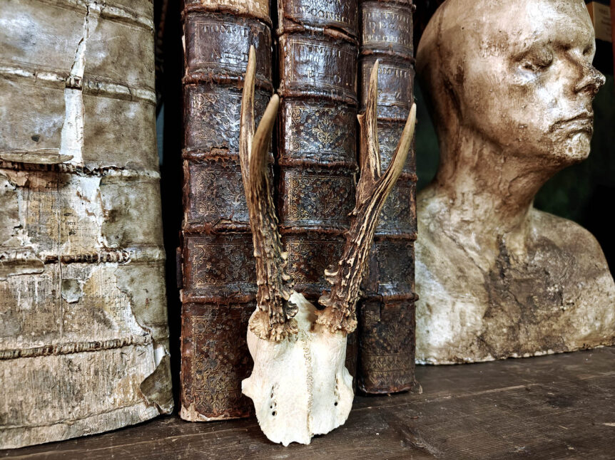 Alkuperä: Ranska Ajankohta: 1900-luvun loppu Laji: Capreolus capreolus (metsäkauris) Koko: K 26 cm, L 10 cm, S 12 cm Rakenne: Trofeeksi sahattu yläkallo (kallonpohja), johon sarvet ovat kiinnittyneet luonnollisessa muodossaan. Metsäkauriille tyypilliset sarvet, helmimäinen tyviosa ja siro, kevyt kallorakenne. Luun pinta on vaalea ja tasainen, sarvien sävy lämmin ruskea. HUOM! Kyseisiä kalloja on muutama ja ne voivat poiketa hiukan kuvassa …
