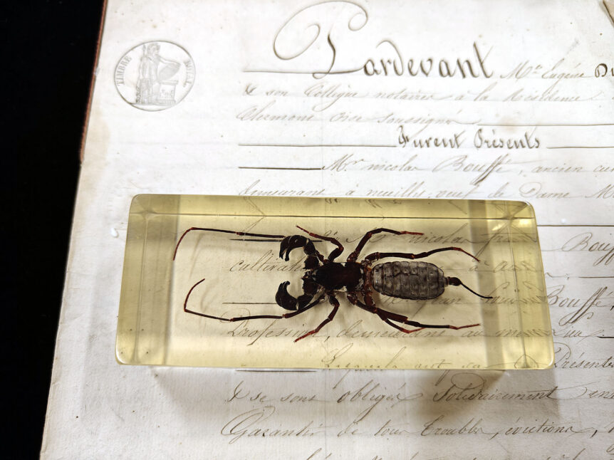 Laji: Siimaskorpioni (Thelyphonida) – tunnistus vahvistamatta Kokoelma: Natura Obscura Arkistoluokka: Biologinen näyte / kapseloitu näyte / ei luokiteltu Säilytyspaikka: Old Illusions – Natura Obscura, Hylly 1B Turvallisuustaso: Bio anomalia taso III – Turvallinen Tiedonlähde: Kenttäraportti, Tuntematon kerääjä Alkuperä ja ajankohta: Eurooppa – arvioitu talteenotto 1900/2000-luvun taite, tarkka päiväys tuntematon Näytteen koko: 11 x 4 x 3 cm (ISO KUUTIO) Lisätiedot: …