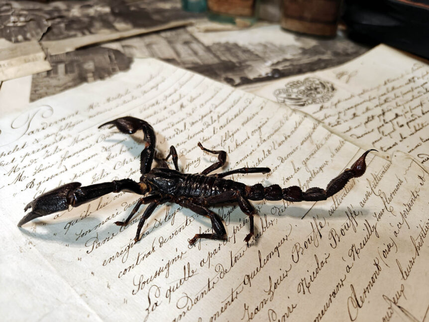 Alkuperä: Trooppinen Aasia Valmistusajankohta: 1900-luvun loppu Laji: Heterometrus laoticus / Heterometrus spinifer Pituus: Pituus 13 cm, leveys 7 cm, häntä n. 6 cm Kunto: Kohtalainen, tätä kaveria on jouduttu kursimaan kasaan ja joku pieni puutoskin voi olla, mutta lopputulos on kerrassaan hieno Muuta: Tämä suurikokoinen ja kiiltävän musta skorpioni kuuluu Heterometrus-sukuun, joka tunnetaan Aasian metsäskorpioneina. Lajit kuten H. laoticus ja …