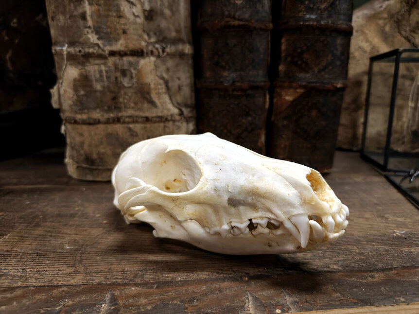 Alkuperä: Eurooppa Laji: Kettu (Vulpes vulpes) Ajoitus: 2000-luku Koko: Pituus 15 cm, leveys 8 cm Kunto: Hyvä, hampaat ja kallon rakenteet ehjiä ja selvästi erottuvia Muuta: Tämä selkeälinjainen ja hyvin säilynyt kallo kuuluu punaketulle (Vulpes vulpes), joka on tunnettu älykkyydestään, sopeutumiskyvystään ja hämäräaktiivisuudestaan. Kallon rakenne antaa viitteitä lajin ”saalistavaan” elämäntapaan. Ketun pitkä kuono, terävät kulmahampaat ja kevytrakenteinen vahva leukalinja kertovat …
