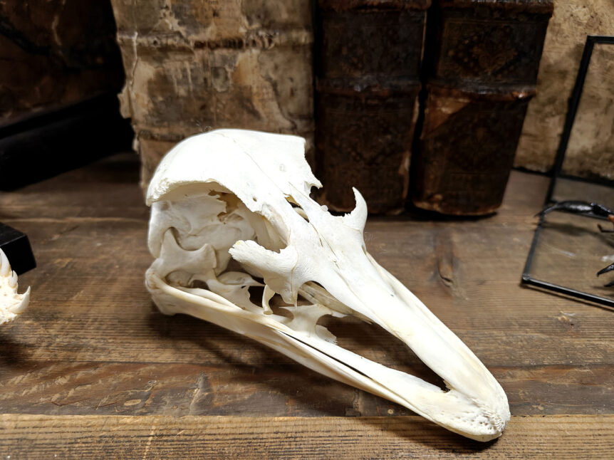 Alkuperä: Afrikka Laji: Strutsi (Struthio camelus) Ajoitus: 1900-luvun loppu Koko: Pituus 18 cm, leveys 10 cm Kunto: Hyvä, luusto ehjä ja rakenteet selvästi erottuvia Muuta: Tämä vaikuttava ja selkeälinjainen kallo kuuluu maailman suurimmalle nykyiselle linnulle (Struthio camelus), joka tunnetaan sekä nopeudestaan ja sopeutumisestaan karuihin savanniympäristöihin. Strutsin kallon rakenne paljastaa lajin erikoistumisen, joka on tärkeää tälle lentokyvyttömälle linnulle. Erikoispiirteitä ovat mm. …