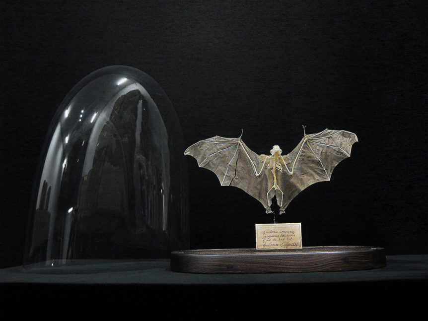 Alkuperä: Pariisin Luonnontieteellisen Museon kokoelma, Ranska Valmistusajankohta: 1838 Tekijä: Tohtori Salomon Müller (1804-1863) Mitat: Lasikuvun korkeus 40 cm, alustan mitat 34 x 18 cm. Itse lepakon mitat: leveys 30 cm ja korkeus 20 cm. Kunto: Kohtalainen, lasikupu hyvässä kunnossa, lepakon rangassa puutoksia, siivessä halkeama Muuta: Äärimmäisen huikaiseva ja harvinainen kohde, joka on ollut osa Pariisin Luonnontieteellisen Museon kokoelmaa. Kohteen tekee …