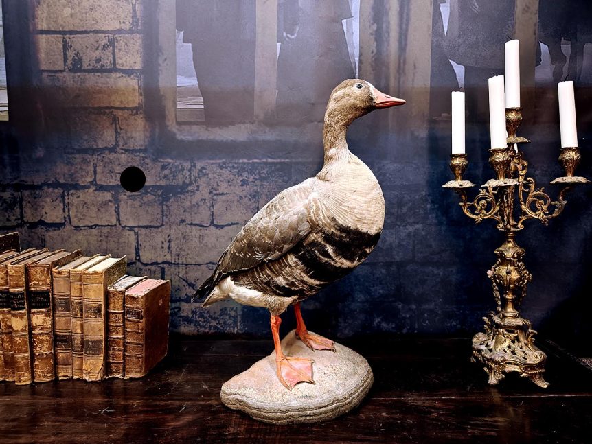 Alkuperä: Eurooppa Valmistusajankohta: 1960–1970 Mitat: Korkeus 53 cm, leveys 50 cm Alusta: Kyllä, upea vanha pahka Kunto: Hyvä; luonnollinen väritys ja höyhenten yksityiskohdat säilyneet selkeinä, pään ja kaulan rakenteet hyvin esillä Cites: Ei tarvita erillistä myyntilupaa, kyseinen yksilö täytetty ennen vuotta 1979 Muuta: Tässä on upea, kookas ja erittäin laadukkaasti täytetty merihanhi, joka saapui meille edesmenneen biologian opettajan omasta kokoelmasta. …