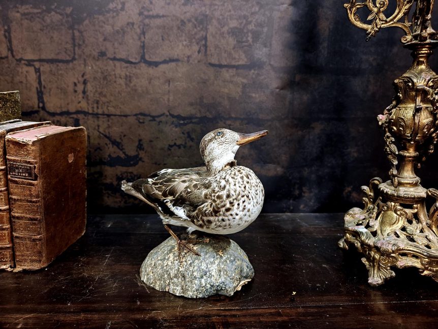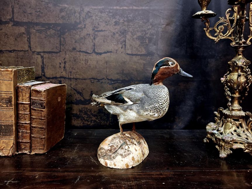Alkuperä: Eurooppa Valmistusajankohta: 1960–1970 Mitat: Korkeus 19 cm, leveys 20 cm Alusta: Kyllä, vanha pahka/kääpä Kunto: Hyvä; höyhenten ruskea–harmaa väritys säilynyt selkeänä, siipipeilin vihreä hohde näkyvissä, jalustan kiinnitys siisti CITES: Ei tarvita erillistä myyntilupaa, kyseinen yksilö täytetty ennen vuotta 1979 Muuta: Tämä siro tavinaaras saapui meille edesmenneen biologian opettajan kokoelmasta, jossa se edusti Suomen pienikokoisimpia pintasorsia. Tavilla on tunnusomainen vihreä …