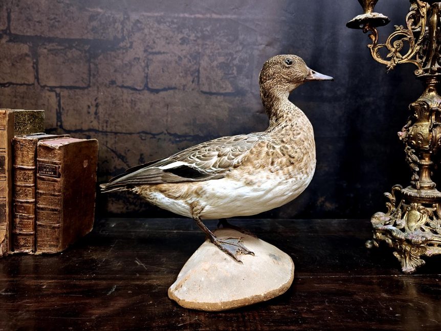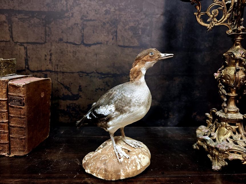 Alkuperä: Eurooppa Valmistusajankohta: 1960–1970 Mitat: Korkeus 25 cm, leveys 27 cm Alusta: Kyllä, vanha pahka/kääpä Kunto: Hyvä; höyhenten ruskea–harmaa väritys säilynyt tasaisena, pään muoto ja siro nokka hyvin esillä, jalustan kiinnitys siisti CITES: Ei tarvita erillistä myyntilupaa, kyseinen yksilö täytetty ennen vuotta 1979 Muuta: Tämä kauniisti täytetty isokoskelonaaras saapui meille edesmenneen biologian opettajan kokoelmasta, jossa se edusti pohjoisten virtavesien ja …