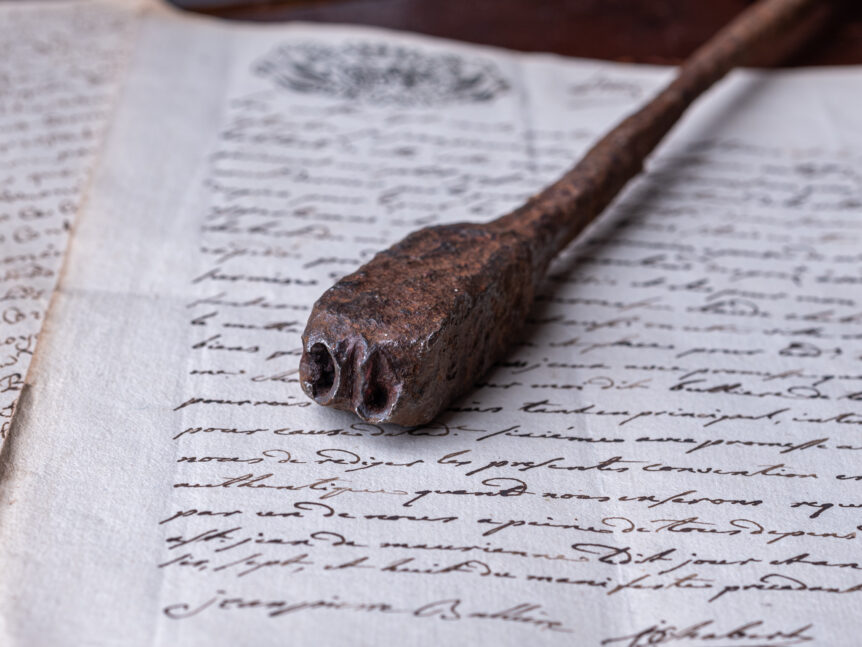 Alkuperä: Eurooppa Valmistusajankohta: 1800-luku Materiaali: Rauta Koko: Pituus 44 cm Kunto: Kohtalainen, pinnoissa raskasta kulumaa / patinaa Muuta: Erittäin brutaalin näköinen polttorauta, jolla on toivottavasti merkattu aikoinaan eläimiä. Polttomerkintää on käytetty / käytetään suurelta osin eläinten merkkaukseen, mutta ennen aikaan myös esim. orjia tai rikollisia merkattiin polttoraudalla. Polttomerkinnässä tulikuuma rauta laitettiin iholle muutamaksi sekunniksi, jolloin ihon pintaan tuli 3-asteen palovamma. …