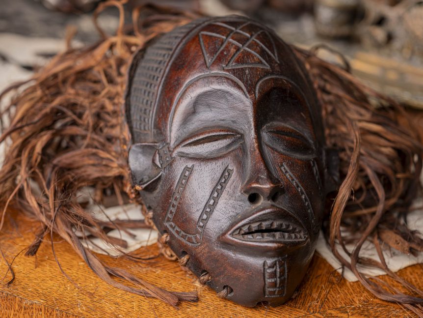 Alkuperämaa: Kongon. demokraattinen tasavalta Valmistusajankohta: 1900-luku Mitat: L35cm × S18cm × K28cm Materiaali: puu, kasvikuitu Kunto: Hyvä, ajanmukaista patinaa / kulumaa Muuta: Mwana Pwo (nuori/kaunis nainen) -naamioita käytetään osoittaamaan kunnioitusta naispuolisille esivanhemmille ja se symboloi ihanteellista äitiä ja naista. Vaikka kyse on naisnaamioista, niin niitä käyttävät kuitenkin miehet. Juhlissa he tanssivat tämmöiset kauneudet päässään miesparin (Chihongon) kanssa tuodakseen kylään hedelmällisyyttä, …