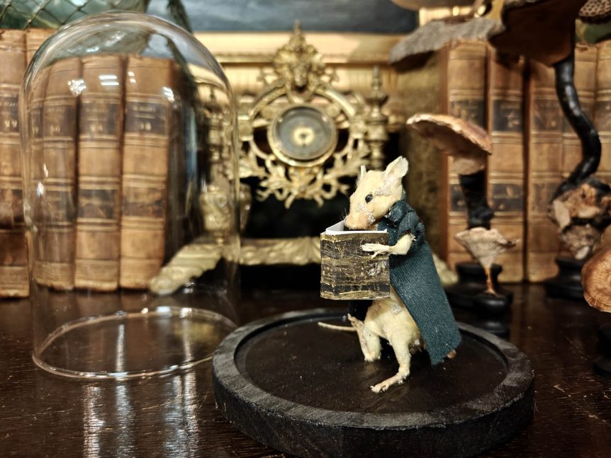 Valmistusajankohta: 1900-luvun loppupuoli Mitat: Kuvun korkeus 19 cm, halkaisija 14 cm. Hiiren korkeus n. 9 cm Kunto: Kohtalainen. Hiiressä kulumaa / puutteita. Kupu uudempi, kunto erinomainen Muuta: Tämä filosofi-hiirulainen on todella symppis kaveri, toki ajan myötä on kärsinyt psorista tai vastaavasta, eli päällisin puolin hiirulaisen kunto kunto näkyy kuvissa. Todellakin voidaan puhua kuriositeettikabinetin helmestä, jos etsii söpöä mutta rujoa tapausta.