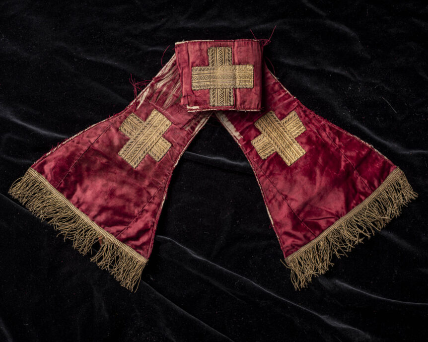 Alkuperä: Italia Valmistusajankohta: 1800-luvun loppu Koko: 85cm × 22 cm Materiaali: silkki, puuvilla, kultakirjailu Kunto: Kehnohko. Ajanmukaista kulumaa / patinaa Muuta: Tämä italialainen 1800-luvun stola on ollut käytössä ilmeisesti pahoja henkiä pois karkottavalla papilla, joten annoimme sille tietenkin lempinimen ”Exorcist”. Stolan käyttöön liittyen pahoja henkiä manasivat perinteisesti pois tähän tehtävään nimetyt katoliset papit, eli eksorkistit. Heidän piti saada paikallisen piispan …