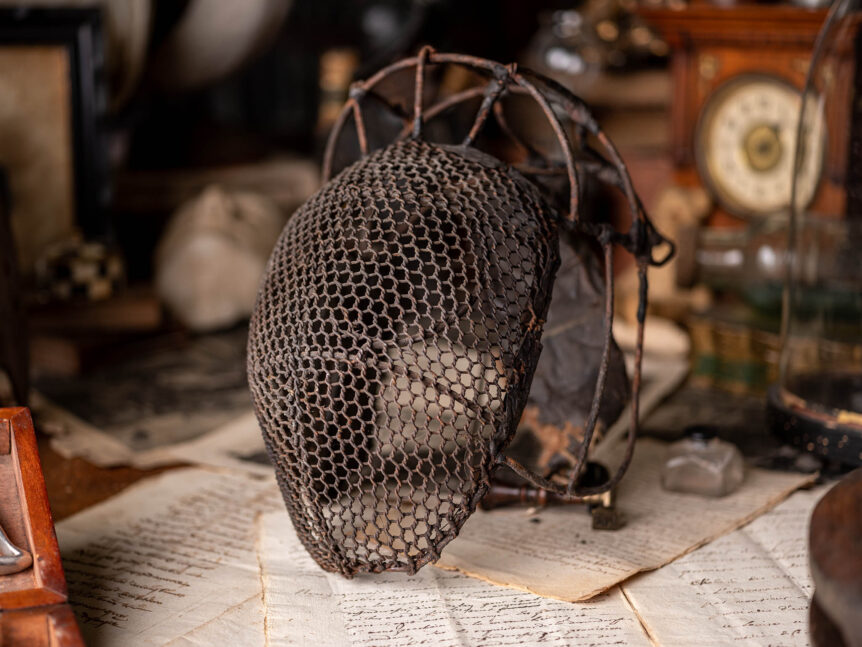 Alkuperä: Eurooppa Valmistusajankohta: 1900-luvun alku Kunto: Rähjäinen, pehmusteet hapertuneet irti ja otettiin ne kokonaan pois vaikka kuvassa vielä jokunen ”riepu” näkyykin Muuta: Rujon tyylikäs post-apokalyptinen miekkailumaski, tämä on kuin suoraan Mad Max -elokuvasta. Maskin kun laittaa tossukiekon maalivahdille päähän, niin ei vastustaja uskalla edes yrittää maalin tekoa. Lisäksi aurinkoisena päivänä tällä saisi aikaan muodikkaat rusketusraidat. Miekkailun historiaa Miekan ja miekkataistelun …