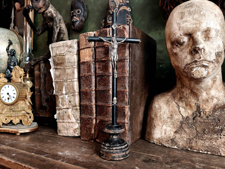 Alkuperä: Ranska Ajankohta: Napoleon III ‑kausi, n. 1850–1870 Materiaali: Mustaksi värjätty puu / eebenpuu, hopeoitu metalli tai messinki (corpus ja yksityiskohdat) Koko: 42 × 17 cm Kunto: Hyvä; metalliosissa kaunis patina, puuosissa ajan tuoma arvokas tummuus Muuta: Tämä vaikuttava pöytäkrusifiksi edustaa 1800–1900‑lukujen vaihteen ranskalaista uskonnollista estetiikkaa, mutta erottuu joukosta yhdellä ratkaisevalla piirteellä… Ristin alaosaan sijoitetulla pääkallo ja ristikkäiset luut ‑symbolilla, …