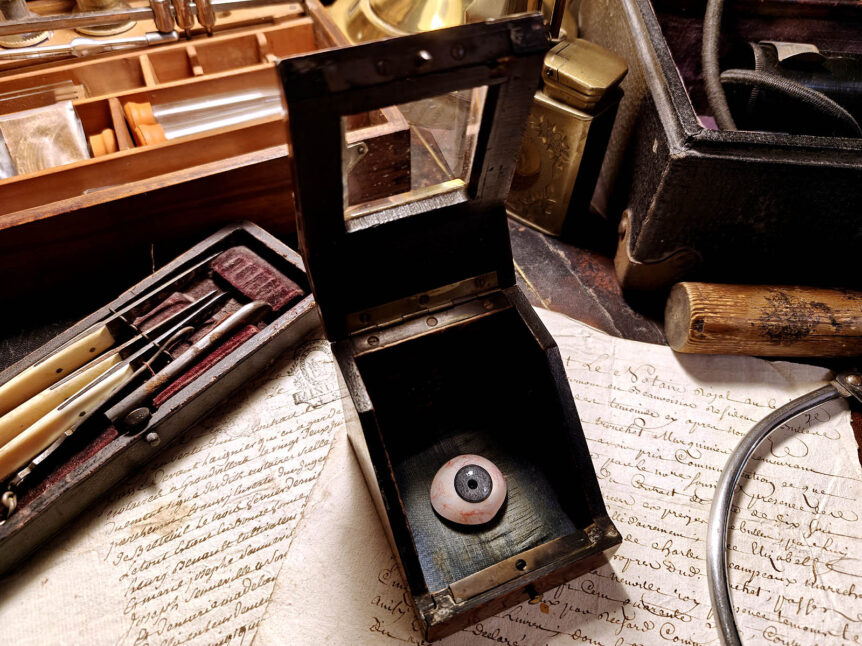 Alkuperä: Ranska Valmistusajankohta: Silmäproteesi 1900-luvun loppupuoli, rasia 1800-1900-luvun taite Silmä: 2,5 cm x 2,0 cm Rasia: Ranska, koko 7,5 x 6,5 x 6 cm Kunto: Hyvä, lasisilmä upeassa kunnossa ja rasiassa mielettömän hieno patina + lukko toimii Muuta: Äärimmäisen upea kohde, harvoin vastaava kokonaisuus tarjolla! Kyseessä yksityiskohtainen ja laadukkaasti valmistettu silmäproteesi (kts. pupilli / verisuonisto), joka on ”kuorrutettu” upealla yli …