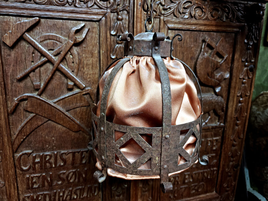 Alkuperä: Keski- tai Pohjois-Eurooppa Valmistusajankohta: 1800–luku, sähköistetty myöhemmin Mitat: Korkeus 26 cm, halkaisija 23 cm, ketju n. 50 cm, joten kokonaispituus n. 76 cm Materiaali: Taottu metalli (todennäköisesti rauta), persikanvärinen kangas, ketjuripustus Toiminta: Toimii Kunto: Hyvä, metallipinnoissa rankka patina ja myös ruostetta, kangas ehjä ja ikääntynyt Muuta: Tässä on erityisen kiehtova ja varmasti uniikki valaisin, joka yhdistää keskiajan fiiliksen rituaaliseen …
