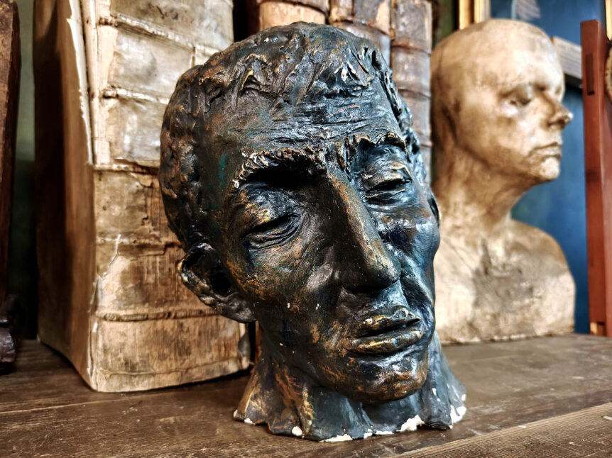 Alkuperämaa: Saksa Taiteilija: Tuntematon Valmistusajankohta: 1900-luku Mitat: Korkeus 25 cm x leveys 20 cm, syvyys 23 cm Materiaali: Keraaminen, pinnoitettu kipsi Kunto: Hyvä, ajanmukaista kulumaa / patinaa Muuta: Todella vaikuttava ja erittäin yksityiskohtainen kasvopatsas, joka on tehty Auguste Rodinin ”Pierre de Wissant”:in mukaan. Tämä kyseinen teos on suosittu kohde keräilijöiden keskuudessa ja siitä on tehty useita erilaisia valoksia ja jäljennöksiä. …