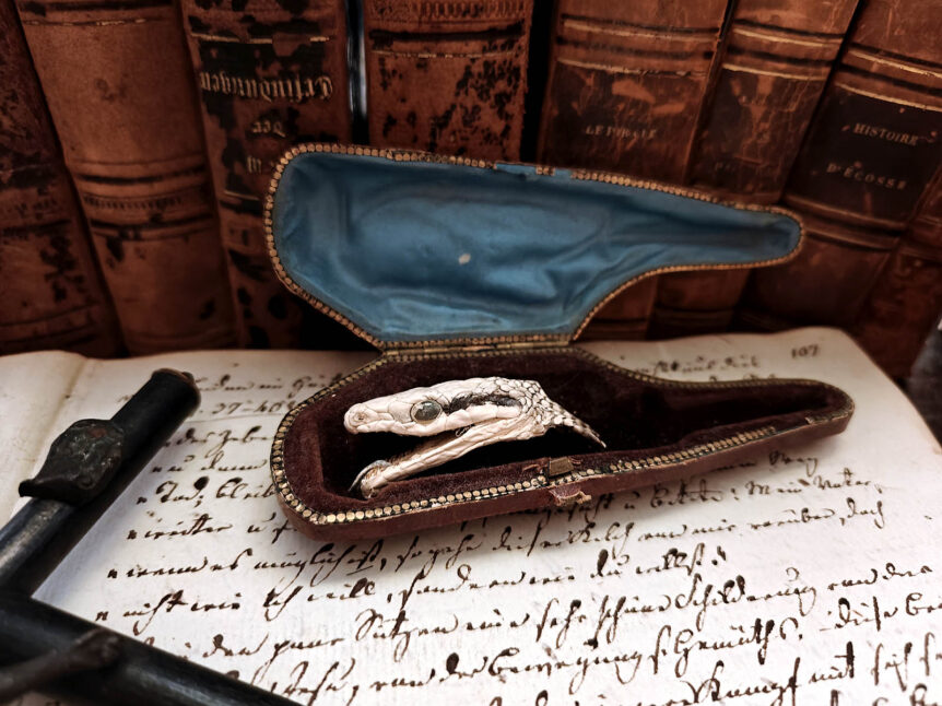 Alkuperä: Eurooppa Ajankohta: Kotelo 1900-luvun alku, parkittu käärmeen pää 2000-luku Laji: Elaphe / Pantherophis -suvun kiipijäkäärme (rottakäärme) Materiaali: Parkittu kiipijäkäärmeen pää, nahka–samettivuorattu meerchaum -piipun kotelo Mitat: Kotelo 12 × 4 cm, käärmeen pää 5 cm Kunto: Hyvä, kotelon aikakauden kuluma ja käärmeen pään luonnollinen patina säilyneet Muuta: On esineitä, jotka eivät vain täytä kummajaisten kabinettia, vaan ne ennemminkin vartioivat sitä. …