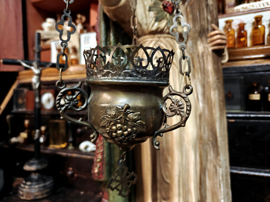 Alkuperä: Ranska Valmistusajankohta: 1900-luvun alku Materiaali: Pronssi Koko: Kokonaiskorkeus 40 cm, astian halkaisija n. 8 cm ja korkeus 15 cm Kunto: Hyvä, pinnoissa kaunis patina Muuta: Tämä upea ranskalainen pyhäkkölamppu (sanctuary lamp” on valmistettu pronssista 1900-luvun alussa ja edustaa hienosti perinteistä kristillistä hartausestetiikkaa, jossa muoto, symboliikka ja käyttötarkoitus kietoutuvat toisiinsa. Vaikka sen ulkoinen hahmo muistuttaa suitsutusastiaa, rakenteen avoimuus, kiinteä ripustus …