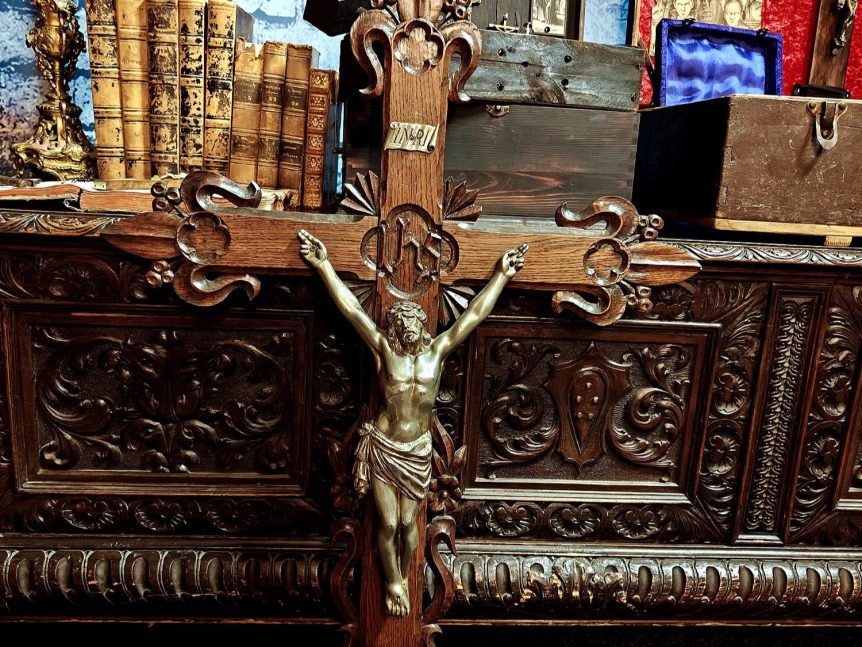 Alkuperä: Ranska Valmistusajankohta: 1800-luvun loppu Koko: Korkeus 86 cm, leveys 60 cm Materiaali: Puu, metalli Kunto: Hyvä, pinnoissa kaunista patinaa Muuta: Harvinaisen kookas, näyttävä ja yksityiskohtainen kirkon seinäkrusifiksi, joka on valmistettu Ranskassa 1800-luvun loppupuolella. Ristin päädyissä on Fleur-de-Lis -koristeet, lisäksi kaiverruksissa esiintyy nelilehtisiä ja kukka-aiheisia motiiveja, jotka tuovat esineeseen goottilaista ja sakraalista ilmettä. Keskellä on taidokkaasti toteutettu metallinen Corpus Christi …