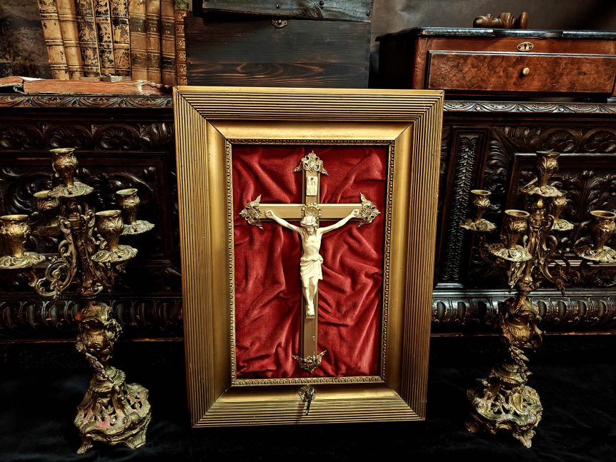 Alkuperä: Saksa (todennäköisesti) Valmistusajankohta: 1890–1920 Mitat: 58 x 43 cm Materiaali: Puu, vaalea veistomateriaali (hartsi/luu), sametti, messinki, koneistossa teräs Soittokoneisto: Valmistajan ankkurileime, tällä hetkellä ei toimi Kunto: Kohtalainen, taulun fyysinen kunto on hyvä, mutta soittokoneisto jumissa. Alkuperäinen avain mukana. Muuta: Tämä meidän mielestä jopa erikoisen hieno mekaaninen krusifiksi edustaa 1900-luvun alun eurooppalaista devotionalista esineistöä, jossa uskonnollinen kohde yhdistettiin aikakauden hienomekaniikkaan. …