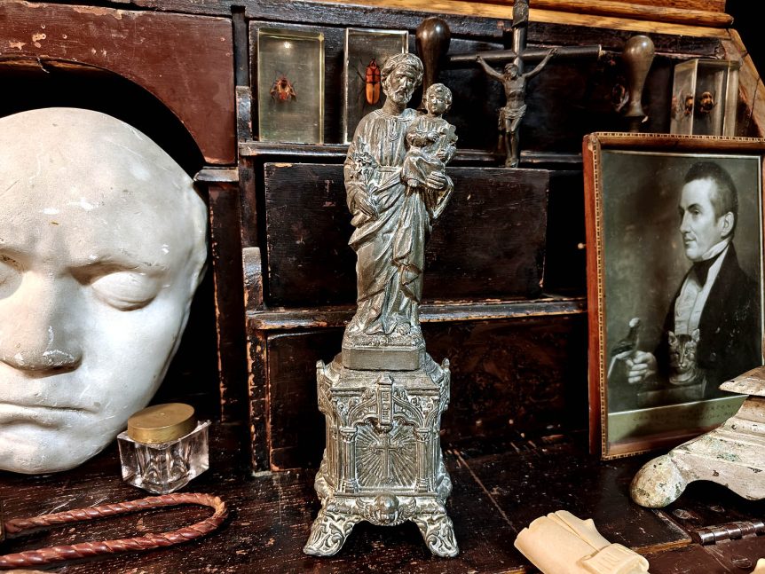Alkuperä: Eurooppa Valmistusajankohta: 1800-1900-luvun taite Koko: Korkeus 24 cm, jalusta 8 x 8 cm Materiaali: Valumetalli / tina Signeeraus: Kyllä, ”A.F.” Kunto: Hyvä; pinnoissa kaunis patina, ajanmukaista kulumaa, yksityiskohdat selvästi säilyneet Muuta: Tämä noin 100 vuotta vanha uskonnollinen veistos esittää pyhää Joosefia, Kristuksen maallista isää, joka kantaa Jeesus-lasta sylissään. Patsas on valmistettu valumetallisesta ja sen jalusta on koristeltu goottilaisilla kohokuvioilla, …