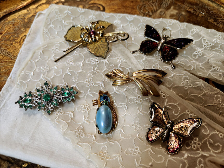 Alkuperä: Englanti / Eurooppa Määrä: 6 kpl Ajoitus: n. 1950–1970 Koko: pienin 3 cm, suurin 7 cm Materiaalit: metalliseokset, lasikivet, emali, helmi‑elementit Kunto: hyvä; normaalia ikäpatinaa ja käytön jälkiä Provenienssi: Kuulunut osana englantilaisen rouvan perintökokoelmaa Muuta: Tämä kuuden pukukorun / rintaneulan kokonaisuus on peräisin englantilaisen rouvan henkilökohtaisesta korukokoelmasta, joka koostui mm. kahdesta pienestä ja huolella säilytetystä pukukoruryhmästä. Kokoelma heijastaa 1900‑luvun …