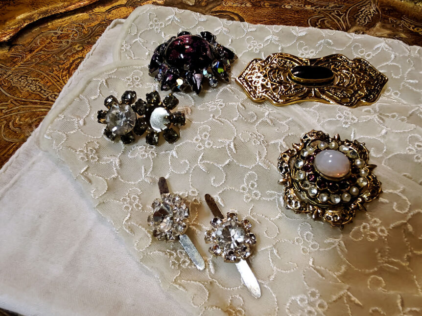 Alkuperä: Englanti / Eurooppa Määrä: 6 kpl Ajoitus: n. 1950–1970 Koko: pienin 1 cm, suurin 6 cm Materiaalit: metalliseokset, lasikivet, helmi‑elementit, kristallit Kunto: Hyvä, normaalia ikäpatinaa ja käytön jälkiä Provenienssi: Kuulunut osana englantilaisen rouvan perintökokoelmaa Muuta: Tämä kuuden pukukorun / rintaneulan kokonaisuus on peräisin englantilaisen rouvan henkilökohtaisesta korukokoelmasta, joka koostui mm. kahdesta pienestä ja huolella säilytetystä pukukoruryhmästä. Kokoelma heijastaa 1900‑luvun …