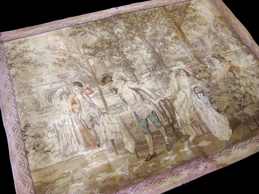 Alkuperä: Ranska Valmistusajankohta: 1900-luvun alku Aihe: Alkuperäinen maalaus ”A Café by the River”, tekijänä Alonso Pérez (1881–1914) Koko: 106 cm x 82 cm Kunto: Hyvä, kankaassa kulumaa, värihaalistumista Muuta: Tämä on todella kaunis ranskalainen gobeliini, josta saat sisustukseesi todellisen katseenvangitsijan. Gobeliinissa on kaunista ajan patinaa ja sen olemus hienoine aiheineen on todella hurmaava. Vastaavia aidosti vanhoja gobeliineja on hankala löytää …