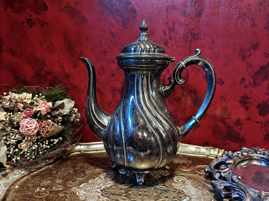 Alkuperä: Ruotsi Valmistusajankohta: 1900-luvun alkupuoli Valmistaja: Ei tiedossa Mitat: Korkeus 24 cm ja leveys 22 cm Materiaali: Uushopea? (katso leimaukset) Kunto: Hyvä, pinnoissa upea patina Muuta: Todella kaunis ja pinnoiltaan patinoitunut kannu, josta kelpaa kaadella hienommillekin vieraille. Kannun pohjassa leimaukset, kuva ja myös leimaukset hiukan epäselvät.