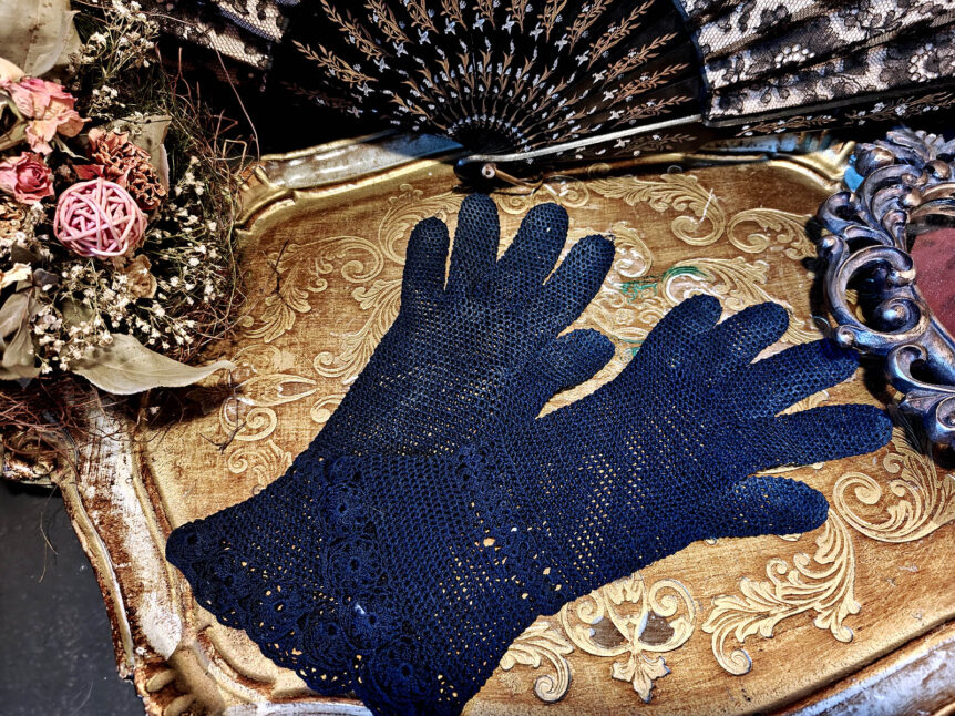 Alkuperä: Ranska Valmistusajankohta: 1900-luvun alkupuoli Koko: Koko 6-7, käsineiden pituus 25 cm Materiaali: Käsin virkattu pitsi, tummansininen Kunto: Hyvä Muuta: Nämä hienostuneet pitsikäsineet edustavat 1900‑luvun alkupuolen ranskalaista juhlapukeutumista, jossa eleganssi ja hienovarainen muodollisuus olivat keskiössä. Käsineitä käytettiin erityisesti iltajuhlissa, tanssiaisissa ja häätilaisuuksissa, joissa ne täydensivät asukokonaisuutta ja viestivät kantajansa hienostuneisuudesta. Pitsikäsineet olivat erityisen suosittuja 1940–1950‑luvuilla, mutta niiden juuret ulottuvat syvälle belle …