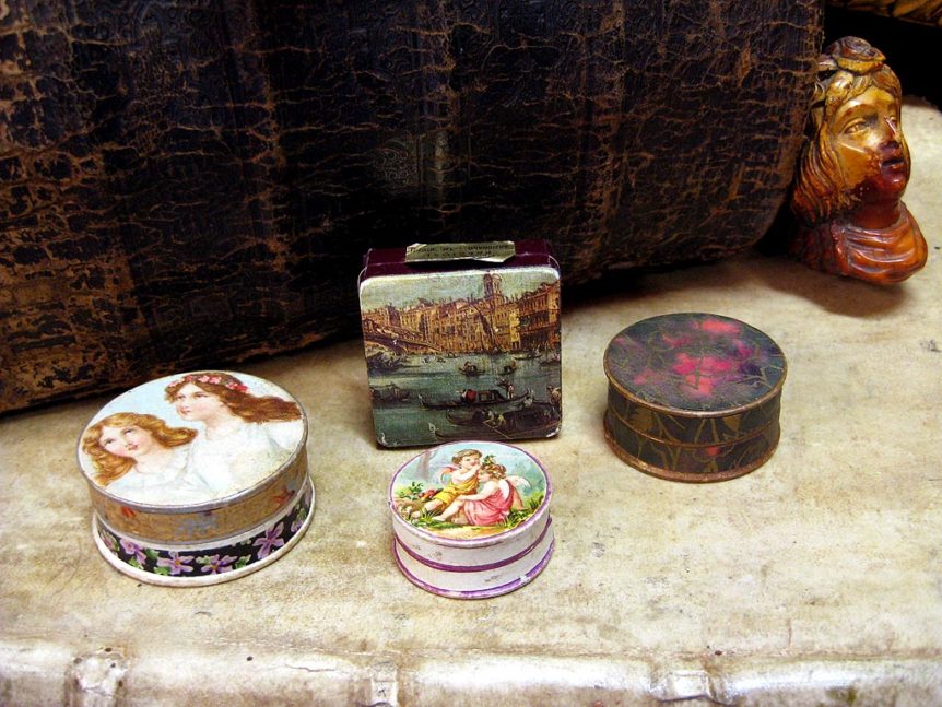 Alkuperä: Englanti Valmistusajankohta: 1900-luvun alkupuoli Koko: Halkaisijat 3,5 cm – 4,5 cm Materiaali: Pahvi / kartonki Kunto: Hyvä, pinnoissa ajanmukaista kulumaa / patinaa Muuta: Erittäin upea neljän siron säilytysrasian kokoelma, joissa kauniit kuvat / yksityiskohdat.