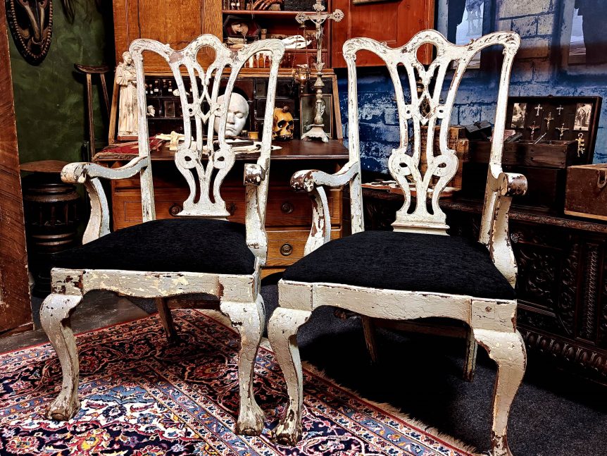 Alkuperä: Ruotsi Valmistusajankohta: 1800-luku Koko: Leveys 75 cm, syvyys 60 cm, korkeus 114 cm (istuinkorkeus 50 cm) Kunto: Hyvä, pinnoissa upea rustiikkisuus, tyylikäs musta samettiverhoilu (myöhempi), maalipintaa korjattu Muuta: Rappioromantiikkaa parhaimmillaan… Kyseessä on huikaisevan kaunis ja kookas tuolipari mihin tahansa paraatipaikalle. Tuolien väri on kaunis, eli kustavilaisen harmaa-valkoinen. Pinnoissa erittäin upea patina / kuluneisuus, todellinen sisustajan herkkupala tuoliparin muodossa.