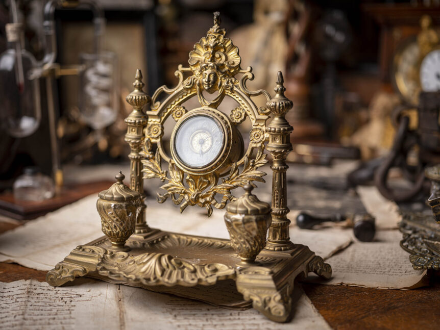 Alkuperä: Ranska Valmistusajankohta: 1900-luvun alku Koko: 29cm × 15cm × 27cm Materiaali: Messinki Kunto: Hyvä. Ajanmukaista käytön jälkeä ja patinaa. Kellosta puuttuu vetoavain, eikä sen toiminnasta ole tietoa. Muuta: Runsaasti koristeltu ja suorastaan majesteetillinen kirjoitusneuvo antaa ylellistä tunnelmaa jokaiselle työpöydälle.