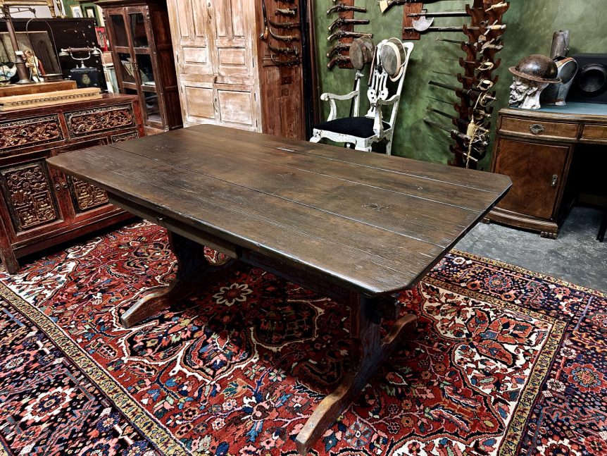 Alkuperä: Suomi Valmistusajankohta: 1800-luvun alkupuoli Koko: Pituus 173 cm, leveys 90 cm ja korkeus n. 75 cm Kunto: Hyvä, upeasti kauttaaltaan entisöity pöytä, jalkaosissa alkuperäinen väri ja huikaisevan kaunis patina Muuta: Myynnissä on nyt todellinen antiikkiunelma, eli täydellisen upea yli 200 vuotta vanha talonpoikaisruokapöytä. Kyseessä on 1800-luvun alkupuolella tehty 6-hengen ruokapöytä, joka edustaa kotimaista talonpoikaisantiikkia parhaimmillaan. Tämä antiikkipöytä on entisöity …