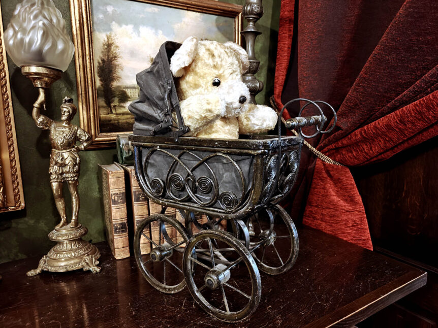 Viktoriaaninen nallevauva ”Unisilmä” vaunuissa, 1900-luvun alku