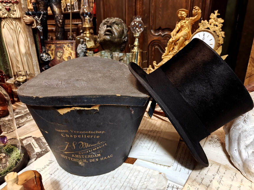 Alkuperä: Amsterdam, Rotterdam, Den Haag, Alankomaat Ajoitus: 1800/1900 luvun taite Materiaali: Silkkiplyysi (hattu), pahvi (matkalaatikko) Koko: Laatikon koko 35 x 29 x 19 cm, hatun sisäosan ympärysmitta on n. 52-54 cm Kunto: Hattu hyvässä kunnossa, laatikossa ajan tuomaa kulumaa Muuta: Tämä silinterihattu ja sen alkuperäinen matkalaatikko ovat peräisin hollantilaiselta hatuntekijältä H. Meauderilta, jonka yritys kantoi arvostettua Hofleverancier arvonimeä, eli Alankomaiden …