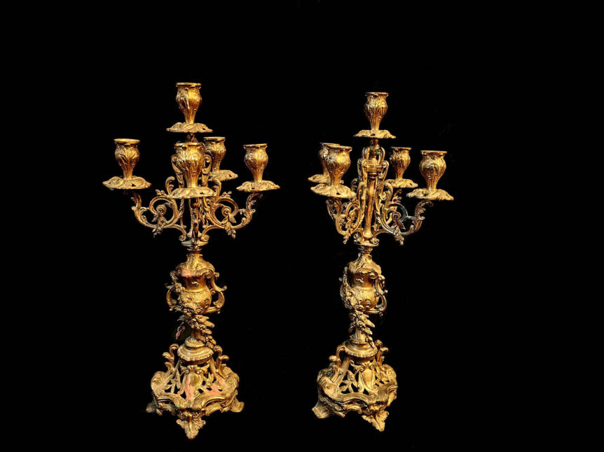 Alkuperä: Ranska Ajoitus: 1800-luvun puoliväli Materiaali: Kullattu pronssi (ormolu) Mitat: Korkeus 50 cm, leveys 25 cm Kunto: Hyvä, iänmukaista patinaa ja kulumaa Muuta: Tämä näyttävä kandelaberipari edustaa ranskalaista Ludvig XV- tyyliä parhaimmillaan! Se tarkoittaa runsaita, elävästi kaartuvia muotoja, epäsymmetristä rokokoon leikkisyyttä ja kullatun pronssin lämpimän hehkuvaa loistoa. Jokainen yksityiskohta, kuten akantuslehdet, kukkaornamentit, sulavat voluutit ovat valettuna kynttelikköihin ja viimeistelty käsityönä, …