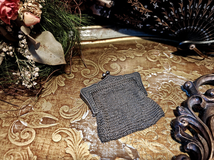 Alkuperä: Englanti Valmistusajankohta: n. 1890–1920 Koko: 7 cm x 7 cm Materiaali: Hopea, leimoja ei nähtävissä Kunto: Hyvä, verkko ehjä, mekanismi toimiva, pinnoissa ajanmukaista kulumaa / patinaa Muuta: Tämä hienostunut ja historiallisesti kiinnostava verkkokukkaro edustaa myöhäisviktoriaanisen ja varhaisen 1900-luvun Art Nouveau tyyliä, jossa käytännöllisyys yhdistyy koristeellisuuteen. Kukkaro on valmistettu hopeaverkosta / hopealangasta ja sen kaiverrettu metallikehys kantaa aikakaudelle tyypillisiä kasviaiheisia …