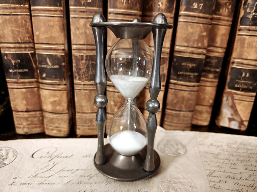 Alkuperä: Tiel, Alankomaat Valmistusajankohta: n. 1950-1960 Valmistaja: KMD Daalderop – Koninklijke Metaalwarenfabrieken voorheen J.N. Daalderop & Zonen (Royal Holland Pewter) Materiaali: Lyijytön tinaseos (95 % Sn), lasi Koko: Korkeus 12 cm, halkaisija 5,5 cm Toiminta: Toimii, valumisaika 2 min 10 sek Kunto: Erittäin hyvä, tina kauniisti patinoitunut, lasi kirkas ja ehjä Muuta: Tämä hollantilainen Royal Holland Pewter ‑tiimalasi edustaa KMD …