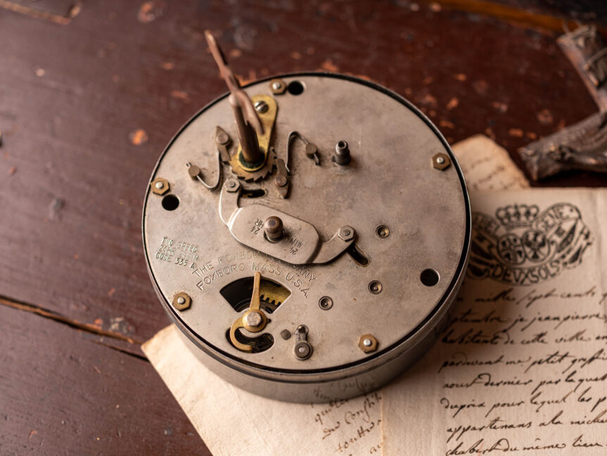 Alkuperä: Yhdysvallat Valmistaja: Foxboro Mass. U.S.A. Valmistusajankohta: 1900-1920 Koko: 12,6 cm, 4 cm Paino: 1,1 kg Materiaali: Messinki ja metalli Kunto: Hyvä, ajanmukaista kulumaa / patinaa. Mekanismi toimii. Muuta: Tämä on erittäin mielenkiintoinen tieteellinen laite, eli ns. varhaisempi Foxboron valmistama ”kellobarometri” 1900-luvun alusta. Barometri viritetään kuin kello ja asetetaan ”paperilevy” sisään, jonka jälkeen musteella täytetty kynä työnnetään sille varattuun ”aukkoon” …