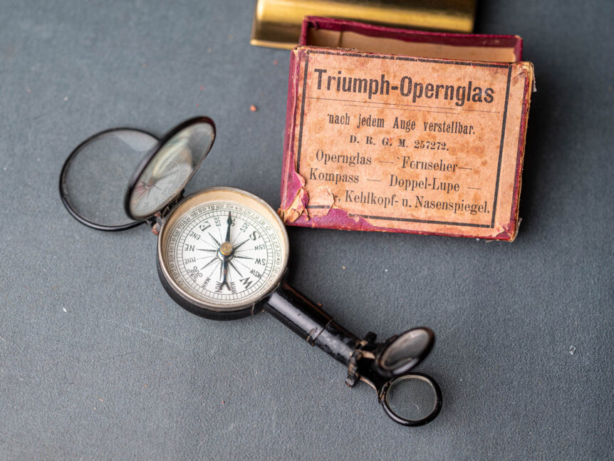 Alkuperä: Saksa Valmistusajankohta: n. 1920–1940 Koko: Laatikko 8cm x 6 cm x 2cm Materiaali: Metallirunko, optiset linssit, peili, kompassi Kunto: Hyvä; mekanismit toimivat, linssit ja peili ehjiä, yksi linssi liimattu. Alkuperäinen pakkaus mukana, kunto kohtalainen. Muuta: Tässä on kyllä jälleen kerran hyvin erikoinen tieteellinen härpätin, voidaan puhua aikakautensa monitoimilaitteesta. Tämä kiehtova ja teknisesti kunnianhimoinen Triumph-Opernglas edustaa aikansa insinööritaidon ja tieteellisen …