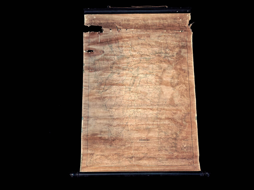 Alkuperä: Ruotsi Julkaisija: Holmbergska Bokhandelns Förlag Ajankohta: 1860 Koko: 113 × 86 cm Materiaali: Puuvillapohjainen paperi (rag paper) taustakankaalla; puulistat ylä- ja alareunassa Kunto: Heikko, kellastumista, repeämiä ja seinäkartoille tyypillistä haurautta Muuta: Tämä suuri ja vaikuttava seinäkartta on yksi varhaisimmista kokonaisesityksistä Ruotsin valtakunnan liikenne- ja viestintäverkosta aikana, jolloin maa oli vasta astumassa modernin infrastruktuurin aikakauteen. Kartan otsikko “Sveriges Communicationer med …