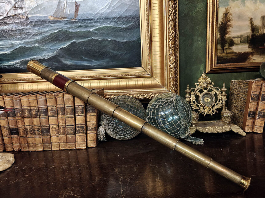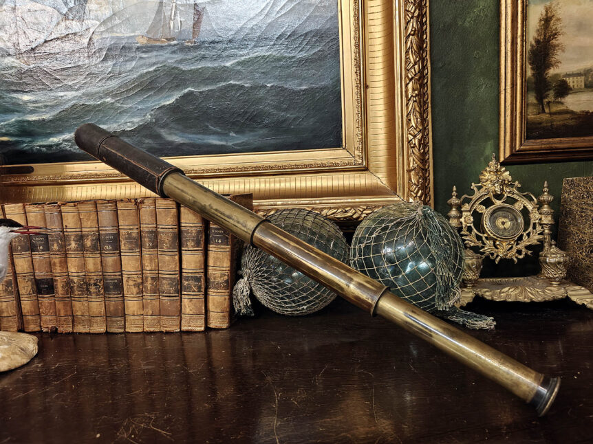 Alkuperä: Englanti, Lontoo Valmistaja: Edward George Wood Valmistusajankohta: 1862–1895 Portaat: 3 Signeeraus: Kyllä. E.G. Wood, 74 Cheapside, London Pituus aukaistuna: 77 cm Optiikka: Ehjä Kunto: Hyvä, ajanmukaista kulumaa pinnoissa Muuta: Signeerattu, arvostetun valmistajan huippulaadukas merikaukoputki, jossa nahkainen kädensija. Silmäosan linssisuoja toimii, toisessa päässä ei suojaa. E.G. Wood, London – viktoriaanisen optiikan taitaja Tämä messinkinen kaukoputki on peräisin Edward George Woodin …