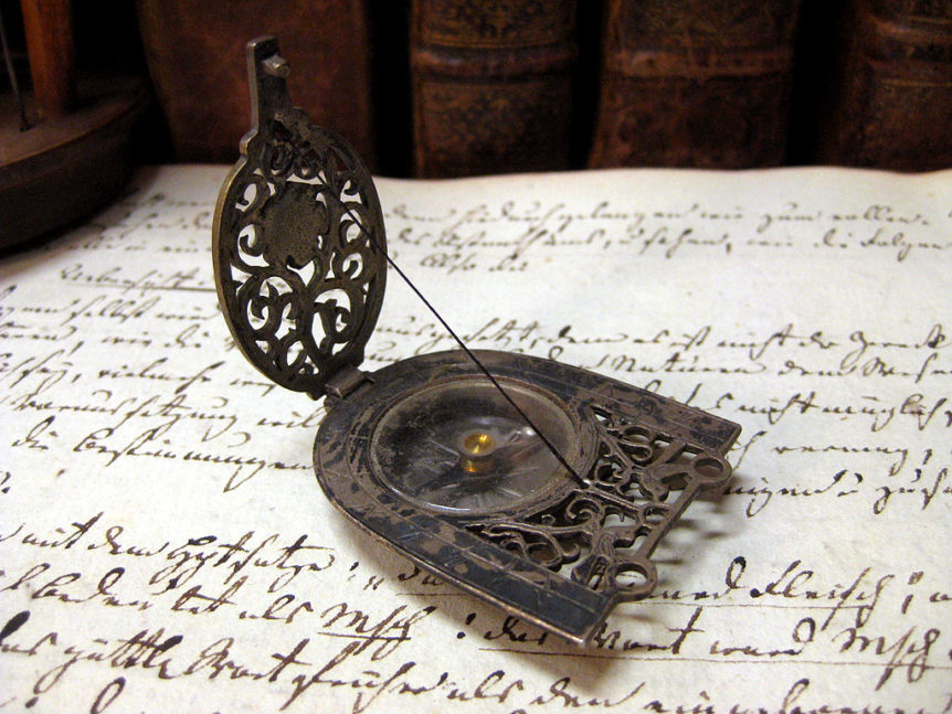 Alkuperämaa: Englanti Valmistusajankohta: 1800-luku Mitat: 5 cm x 4 cm Toiminta: Toimii Materiaali: Pronssi, messinki, hopea? Kunto: Hyvä, esineen pinnoissa kaunis patina, ajanmukaista kulumaa. Muuta: Tämä taskukompassi on huikaisevan hieno, se on kuin suoraan Da Vincin suunnitteluvihkosta. Kompassin kaunis ja aukeava säilytysrasia kiinnityslankoineen on jo itsessään taideteos ja myös itse kompassi toimii edelleen hienosti. Vastaavia aidosti vanhoja 1800-luvun tieteellisen antiikin …