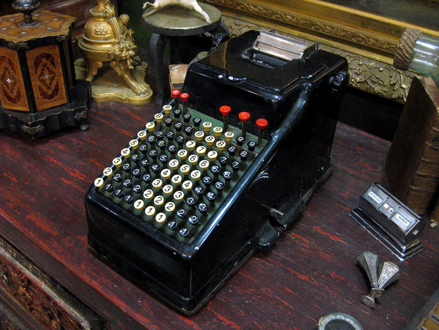 Alkuperämaa: Ruotsi, Malmö Valmistaja: Addo, malli 6 Valmistusajankohta: 1927-1940 Mitat: Leveys 20 cm, syvyys 34 cm ja korkeus 20 cm. Painoa varmaan kymmenisen kiloa. =) Toiminta: Ei testattu Kunto: Kohtalainen, sivussa oleva kampi puuttuu Muuta: Tästäpä sitten toimiston koristeeksi hiukan ”katu-uskottavampaa” ruottalaista laskukonetta, saattaa saada käyttöönkin, mutta toimii vähintään ns. toimiston ”silmäteränä”.